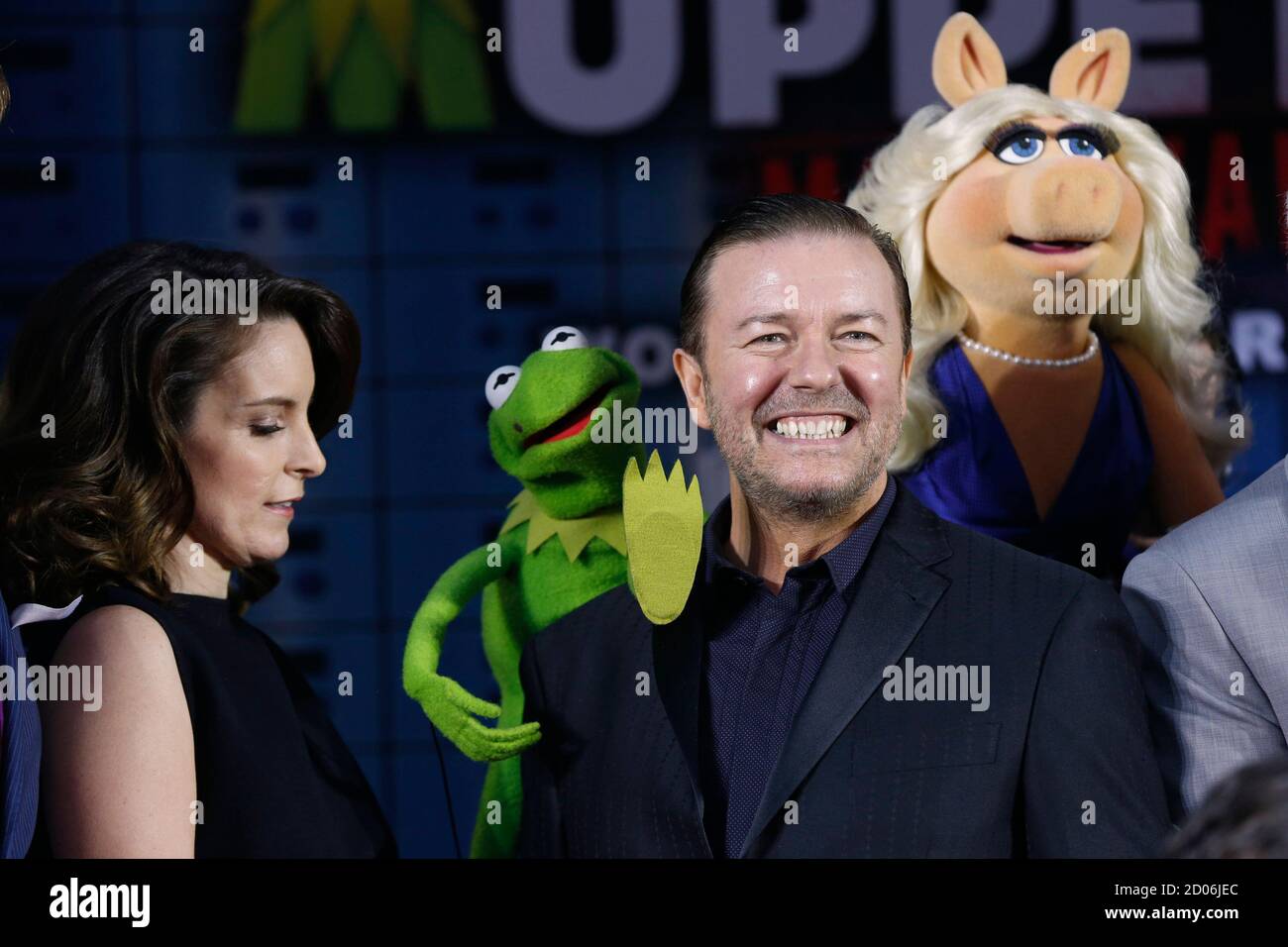 Cast Members Ricky Gervais And Tina Fey L Pose With The Characters Of Constantine And Miss Piggy At The Premiere Of Muppets Most Wanted At El Capitan Theatre In Hollywood California March